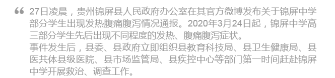 隨著國內(nèi)疫情得到有效的控制,全國各地在做好防護措施的前提下開始陸續(xù)有序地復(fù)工復(fù)課。但是,近日一則“錦屏中學(xué)部分學(xué)生出現(xiàn)發(fā)熱腹痛腹瀉的情況”的報道引起了各位學(xué)生家長和社會各界的高度關(guān)注。
