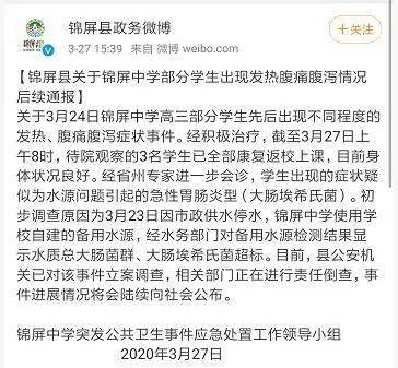 通報稱:經(jīng)省州專家進一步會診,學(xué)生出現(xiàn)的癥狀疑似為水源問題引起的急性胃腸炎型(大腸埃希氏菌)。初步調(diào)查原因為3月23日因市政供水停水,錦屏中學(xué)使用學(xué)校自建的備用水源,經(jīng)水務(wù)部門對備用水源檢測結(jié)果顯示水質(zhì)總大腸菌群、大腸埃希氏菌超標(biāo)。