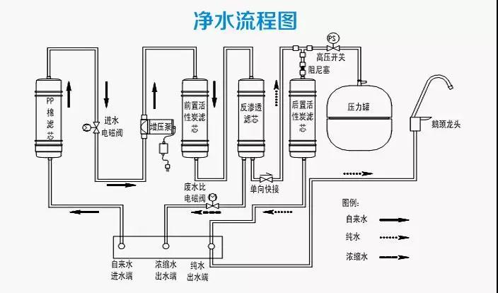 原水(自來水)通過水管進(jìn)入RO反滲透直飲水機(jī)的前三級濾芯進(jìn)行初濾,然后在由增壓泵對水施壓,讓水流進(jìn)RO反滲透膜中,通過RO膜的逆滲透效果精細(xì)凈化水源,然后在將水輸送到壓力桶,由壓力桶保存;當(dāng)需要使用時(shí)在打開壓力桶球閥,通過壓力桶施壓讓水流入最后一級后置活性炭濾芯(主要為凈化水質(zhì)口感),在通過水龍頭產(chǎn)水。詳情可參考凈水流程圖。