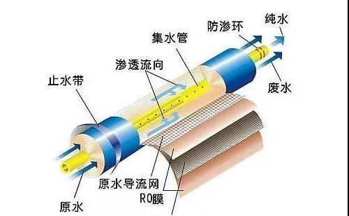 反滲透技術(shù)是利用壓力差為動(dòng)力的膜分離過濾技術(shù),其孔徑小至納米級(1納米=10-9米 ),在一定的壓力下,H2O分子可以通過RO膜,而源水中的無機(jī)鹽、重金屬離子、有機(jī)物、膠體、細(xì)菌、病毒等雜質(zhì)無法透過RO膜,從而使可以透過的純水和無法透過的濃縮水嚴(yán)格區(qū)分開來。